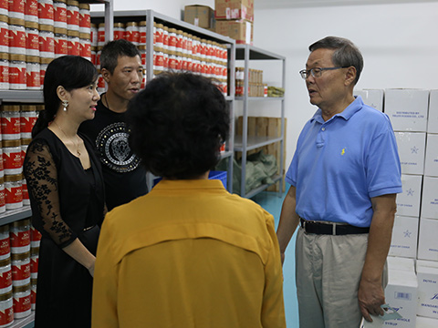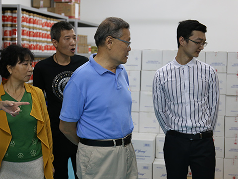 圖為:何清華先生考察細莫食品生產(chǎn)與銷售的每一個環(huán)節(jié)。